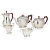 William Suckling Ltd, Birmingham 1931/2, comprising a teapot, twin-handled sugar basin and a milk jug, all of rounded octagonal outline, C-scroll handles, raised on an octagonal foot; together with a matched waterpot and teapot, Sheffield 1945, of slightly baluster oval outline with a threaded border, raised on a threaded oval foot