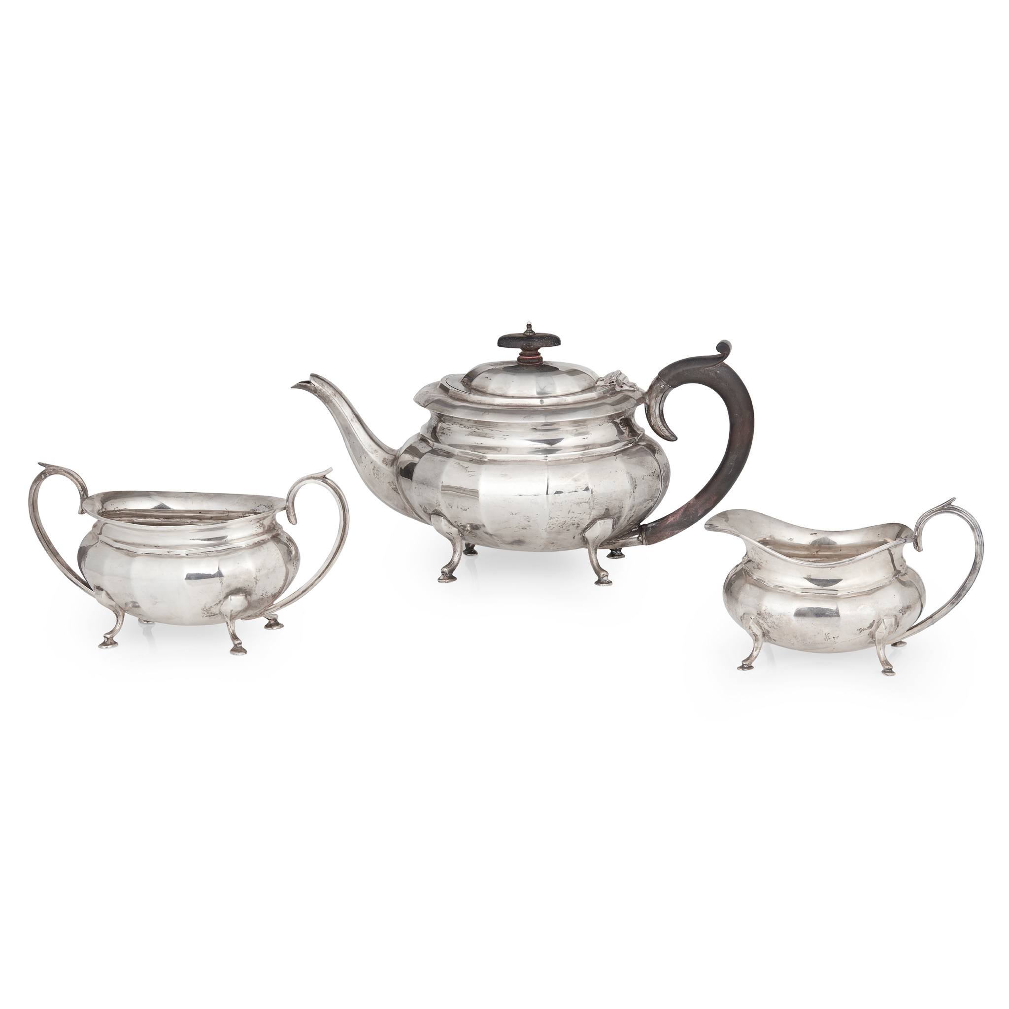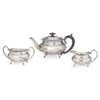 William Adams Ltd., Birmingham 1927, comprising a teapot, twin handled sugar basin, and a milk jug, each of panelled outline, C-scroll handles and raised on four hoof feet