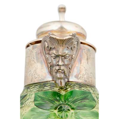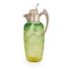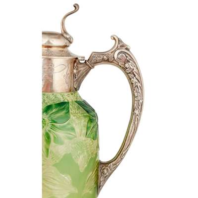 Henry Wigful, Sheffield 1906, the mount with Bacchus mask spout, scroll cast handle, the collar and hinged cover with engraved trailing leaves, with simple thumb piece, the crystal body with finely engraved stylised trailing flowers in a matt ground on the green coloured body