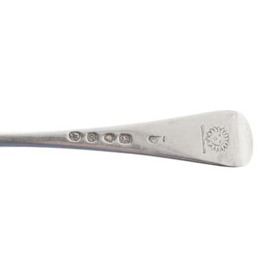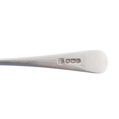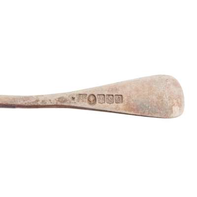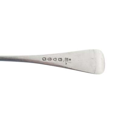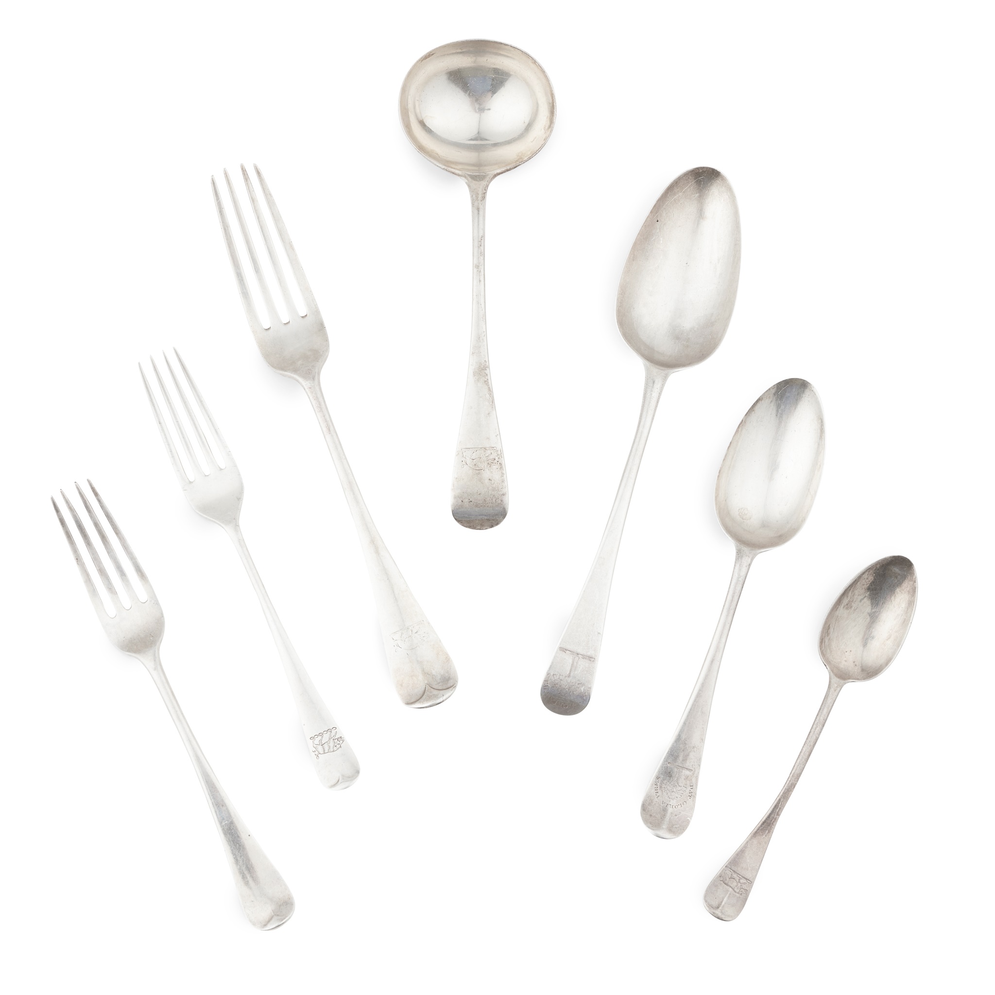 various makers and marks, to include, two sauce ladles, five serving spoons, three tablespoons, four dessert spoons, three smaller; together with eight table forks, nine dessert forks, four dessert spoons and two teaspoons, all of Hanoverian pattern