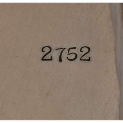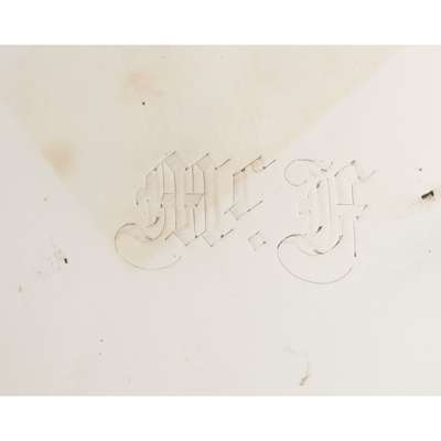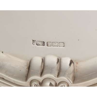 Joseph Rodgers & Sons, Sheffield 1904, of circular outline with a cast shell and scroll border, engraved Gothic initials to centre of dish, raised on three ball and claw feet