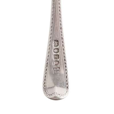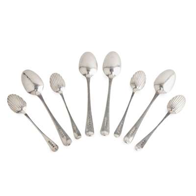 six dessert spoons, Richard Crossley, London 1786 and five for William Eley & William Fearn, London 1801 and one unascribed, all of Old English pattern with, engraved crest to terminal; together with a matched set of twelve teaspoons, with shell bowls and similar bright-cut engraved decoration to stems