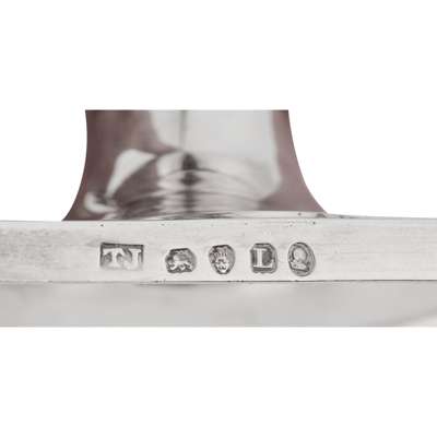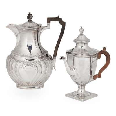 Thomas Johnson, London 1806, of urn form with a threaded border, the interior with tube for iron rod, the side spout with clasped detail to terminal, raised on a square foot, the pull-off lid of baluster form with a knopped ball finial; together with an Edwardian waterpot, Atkin Brothers, Sheffield 1903, of baluster form, with chased floral detail throughout, engraved monogram to the fluted lower body, with an angular handle, raised on an oval foot