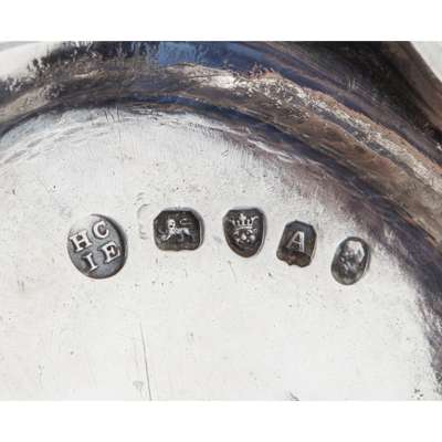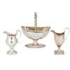 Henry Chawner & John Eames, London 1796, of moulded oval outline, scalloped sides, with a gilt interior to the bowl, an engraved crest to both sides of the bowl, raised on a spreading oval foot; together with a cream jug, London 1778, with beaded borders and S-scroll handle and a helmet cream jug, Hester Bateman, London 1788