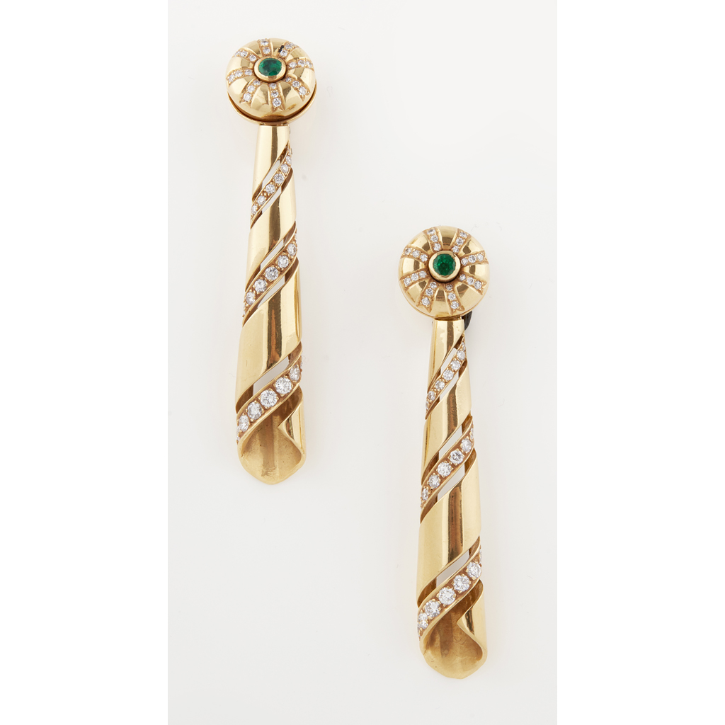 each collet set with a round cut emerald, the domed surround set with small round brilliant cut diamonds, suspending a tapering polished drop with pierced detail set with small round brilliant cut diamonds, to clip fittings, stamped 750