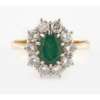 claw set with an oval cut emerald, in a single border of ten small round brilliant cut diamonds, to a plain 18ct gold shank