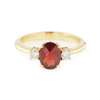 claw set with an oval mixed cut garnet, flanked to either side by two small round brilliant cut diamonds, to a plain yellow metal shank stamped 18k