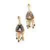 each composed of a round brilliant cut diamond set bale, suspending a triangular panel collet set with ruby, sapphire and emerald cabochons and a small round brilliant cut diamond set panel, suspending belcher link drops terminating in cabochon rubies, emeralds and sapphires, to post and butterfly fittings, stamped 750