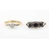 claw set with a single round brilliant cut diamond, each shoulder set with three small eight cut diamonds, to a plain 18ct gold shank; together with a blue and colourless sapphire set cluster ring, to a plain unmarked shank (2)