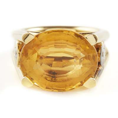 claw set with an oval cut citrine, each split shoulder collet set with a round brilliant cut diamond, shank stamped 750