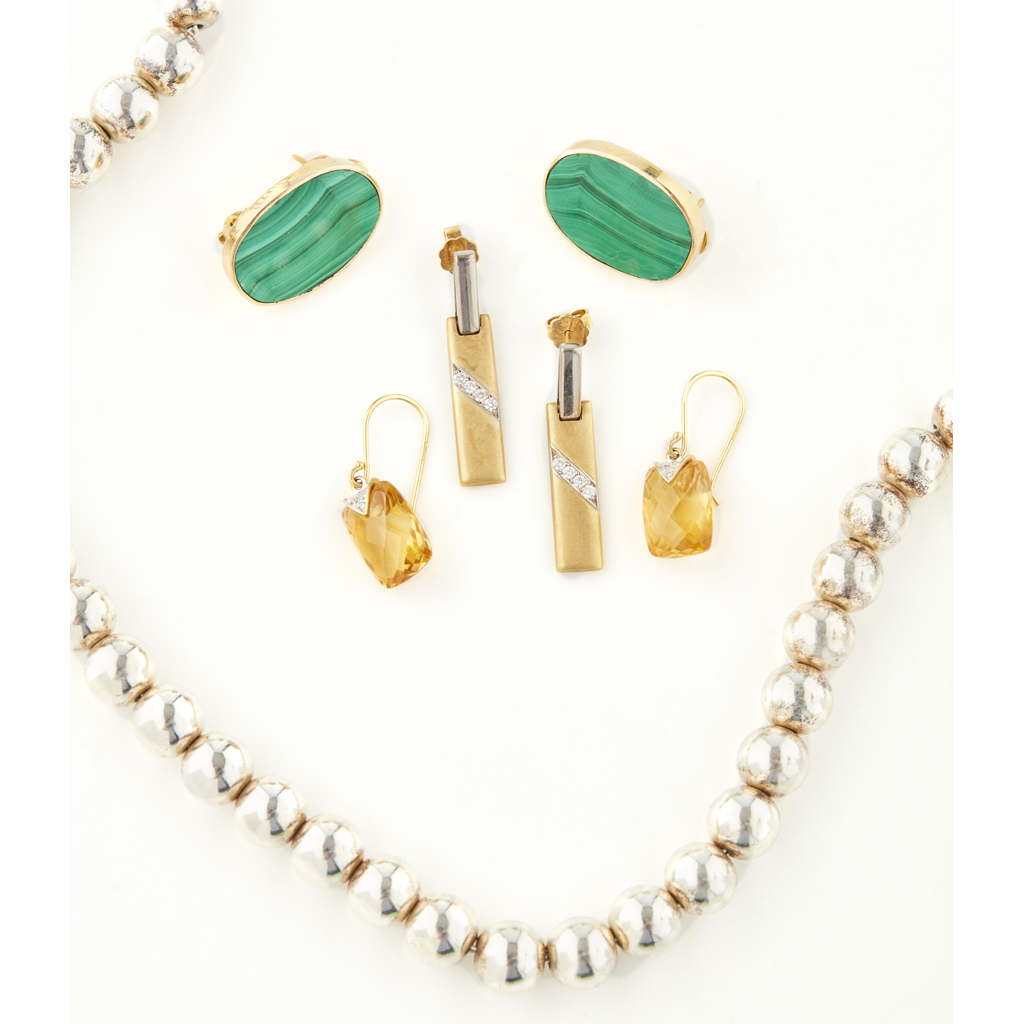 to include a pair of oval malachite set earrings, with post and clip fittings, stamped 750; a pair of citrine and diamond set pendant earrings, to hook fittings; a pair of diamond set pendant earrings, signed Mouawad, stamped 750, to post and butterfly fittings; together with a silver necklace, composed of a single row of polished silver beads, to a T-bar clasp (4)