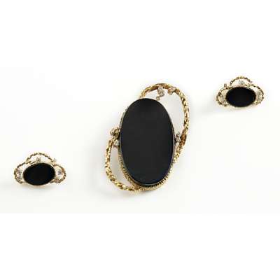 the pendant set with a large oval onyx in an asymmetrical textured surround, set at intervals with nine graduated round brilliant cut diamonds; together with a pair of matching earrings, to post and butterfly fittings, pendant signed PABLO (2)
