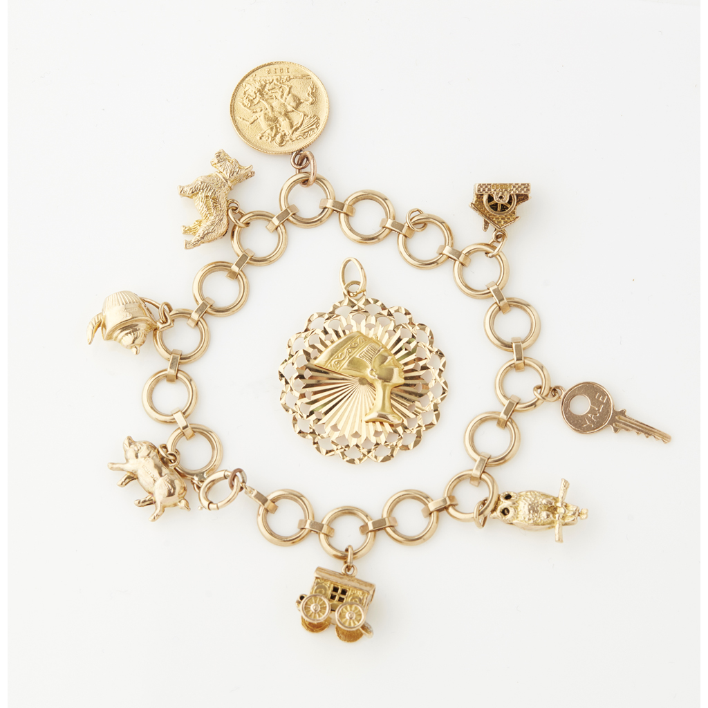 composed of circular links, suspending various charms including a key, a teapot, a caravan and a half sovereign, together with an additional pendant, of circular outline with detail of Queen Nefertiti, stamped 750 (2)