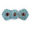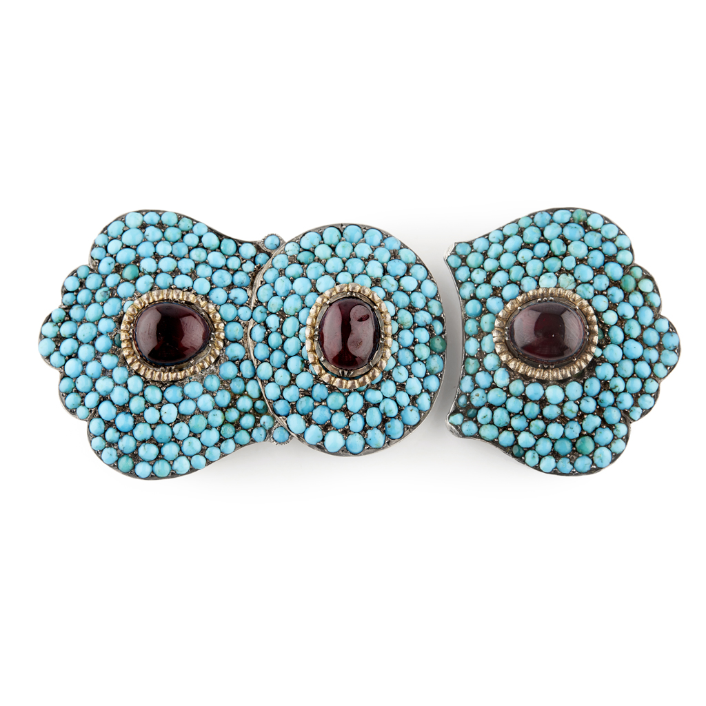 originally a buckle with later double pin additions, pave set throughout with small turquoise cabochons, each panel collet set with a central oval garnet cabochon