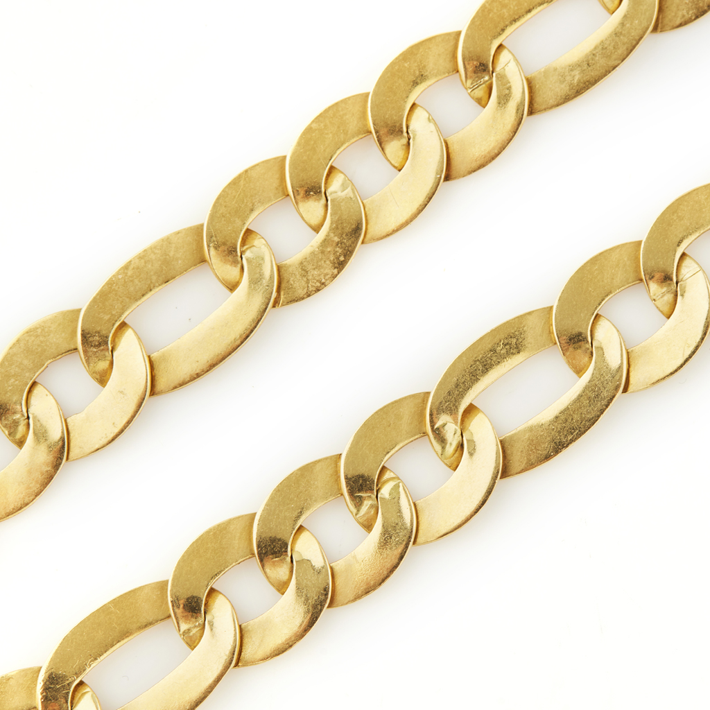 composed of flattened oval and circular links, to a spring lobster type clasp, stamped 750