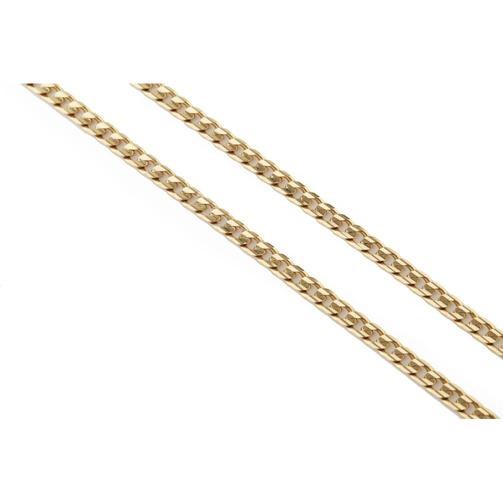 composed of a single row of flattened curb links, to a sprung lobster-type clasp, stamped 750