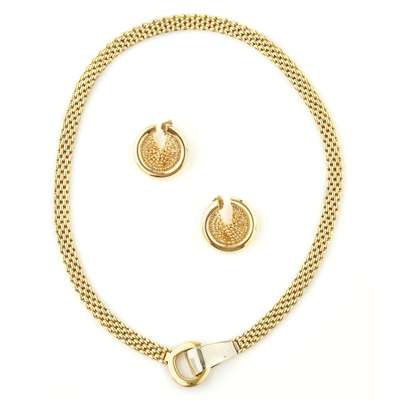 composed of a simple band of brick links, to a clasp and hoop fastening, stamped 750; together with a pair of circular earrings, with woven detail, to post and butterfly fittings, stamped 750 (2)