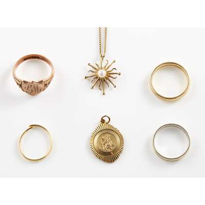 to include a 9ct gold gentleman's signet ring and a 9ct gold wedding band, a 9ct gold St Christopher and another 9ct gold pearl set pendant, to an unmarked chain; together with two 9ct gold wedding bands (qty)
