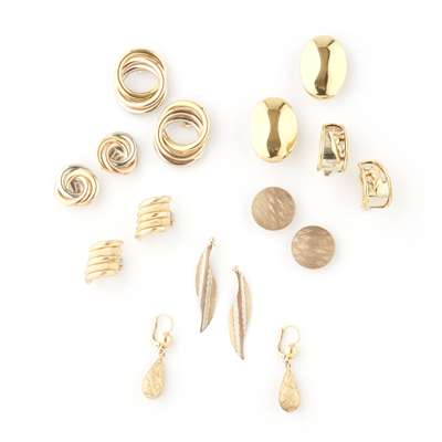 to include a pair of oval domed form, a pair with leopard motif; a pair composed of three interlocking hoops and another of ribbed textured detail, all stamped 750; together with a further four pairs stamped 18ct or unmarked (8)