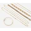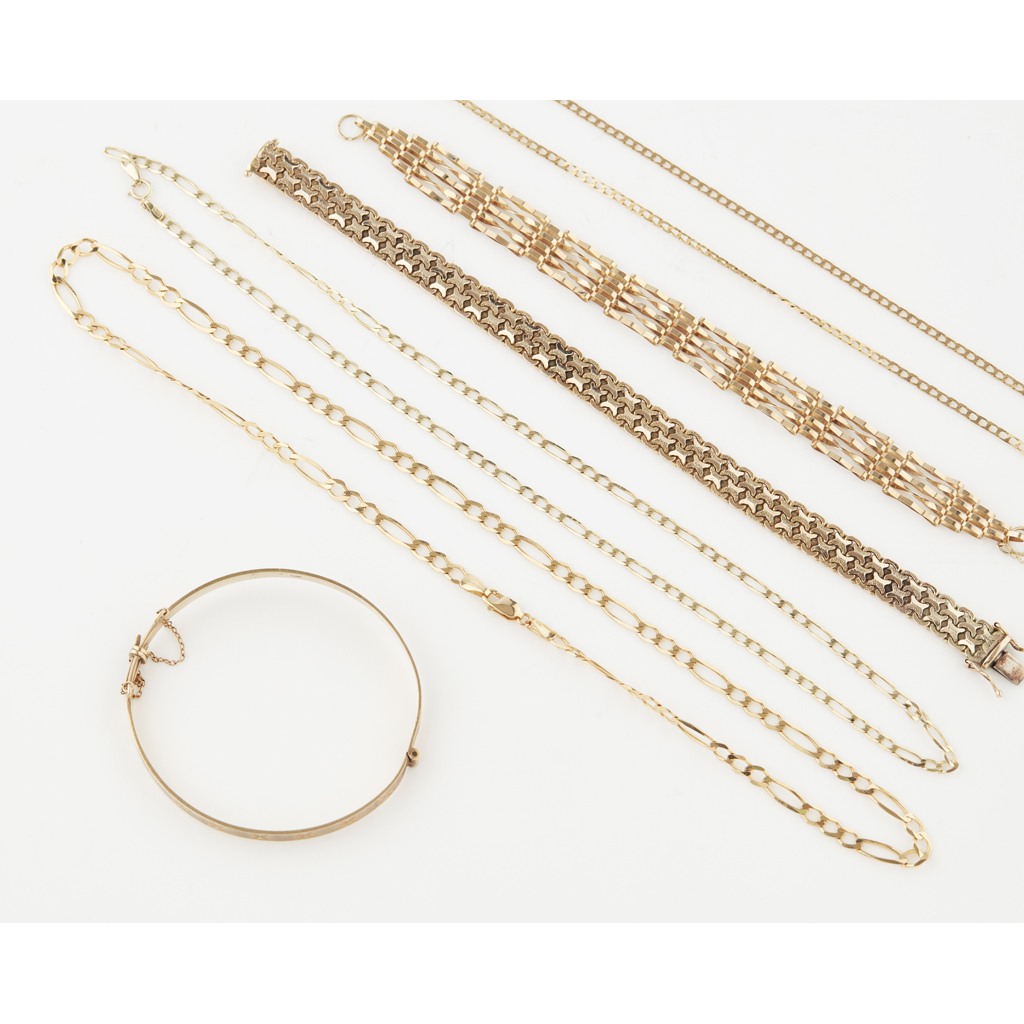 to include; a 9ct gold bangle with bright cut detail; a 9ct gold gate link bracelet; a 9ct gold fancy link bracelet; together with three 9ct gold chains (6)
