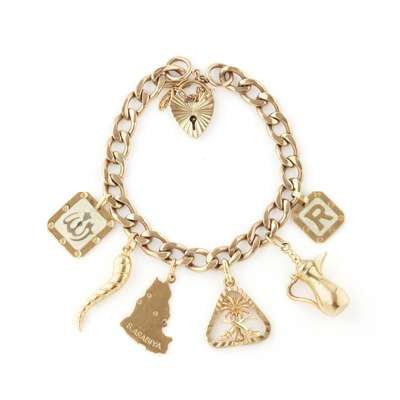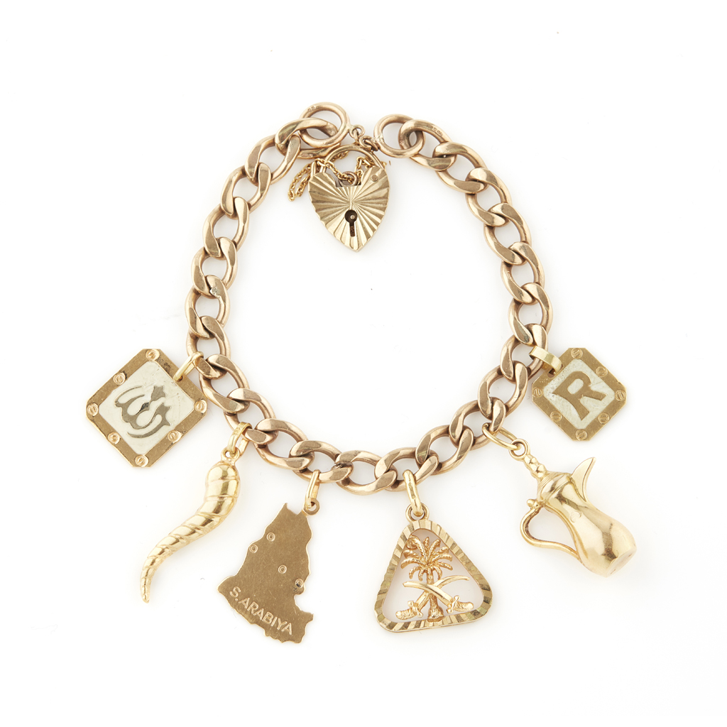 composed of curb links with a heart shaped padlock clasp, suspending various charms including initials, a map of Saudi Arabia, a coffee pot etc