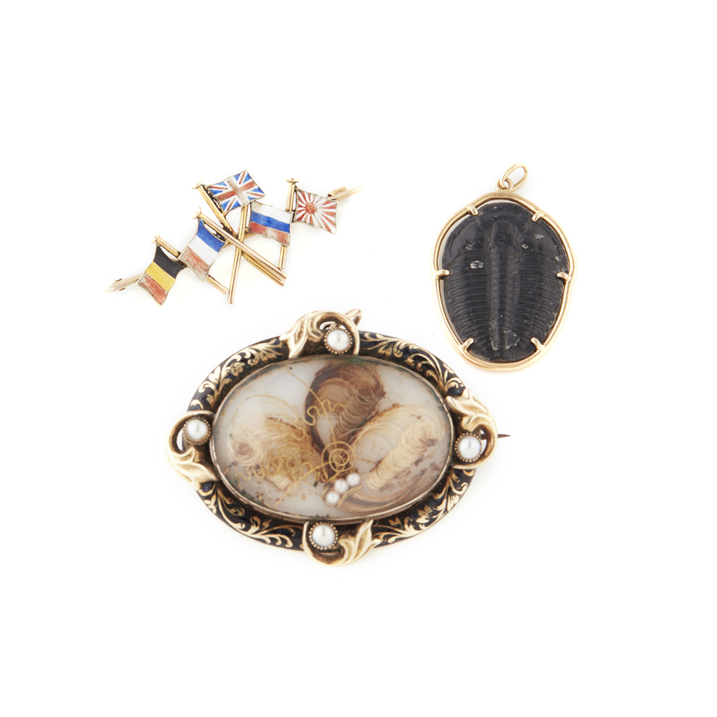 to include a Victorian enamel and pearl set mourning brooch, unmarked; an enamel set flag brooch; together with a fossil set pendant (3)