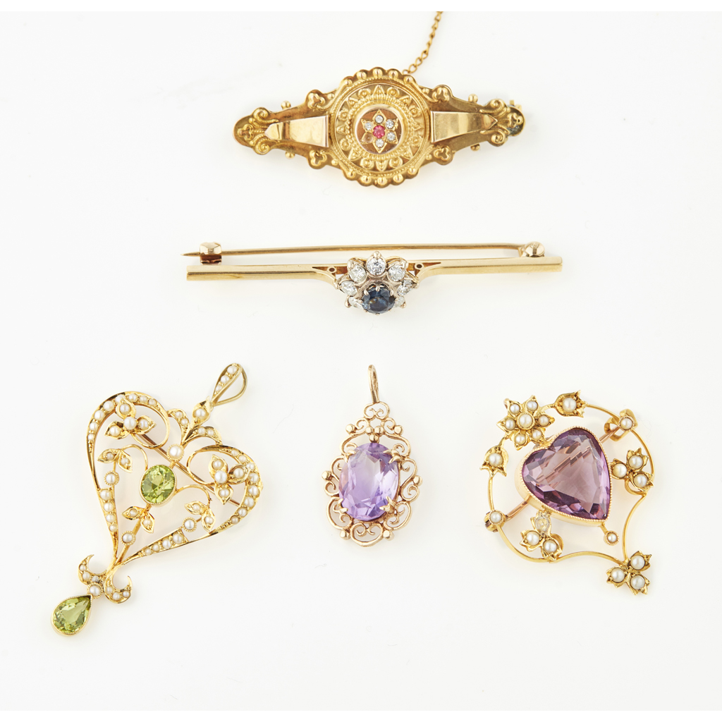 to include an Edwardian seed pearl and amethyst brooch stamped 9ct, another similar, set with peridot stamped 15ct; a sapphire and diamond set bar brooch; a Victorian 9ct gold gem set brooch and a 9ct gold amethyst pendant (5)