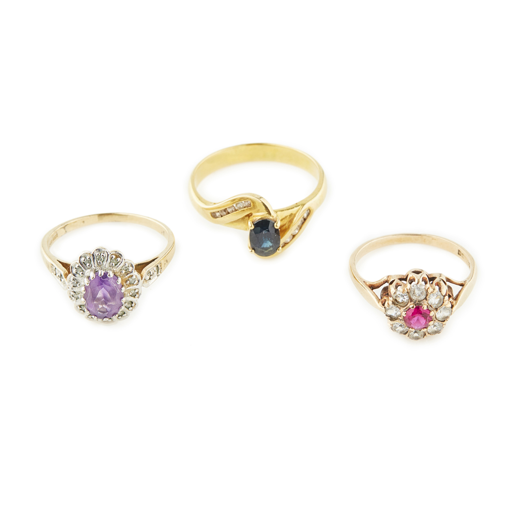 to include a 9ct gold ruby and diamond set cluster ring, an amethyst and eight cut diamond set cluster ring and a sapphire and diamond set ring, stamped 18k (3)