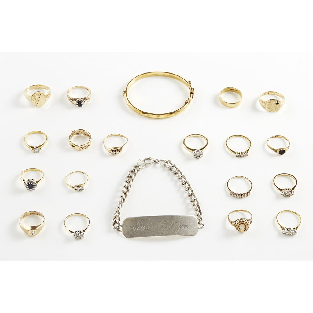 to include an 18ct gold single stone diamond ring, an 18ct gold wedding band, three diamond set rings and a sapphire and diamond cluster ring, all stamped 18ct; ten 9ct gold and gem set rings; various other rings and bracelets (qty)