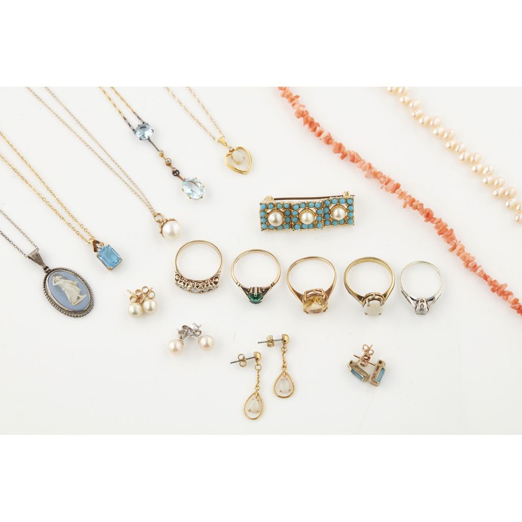 to include a 9ct gold five stone diamond set ring, four various gem set rings, an aquamarine diamond set pendant necklace and three others, four pairs of gem set earrings; together with a coral necklace, a cultured pearl necklace and a turquoise brooch (qty)