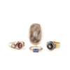 to include a banded agate and diamond set ring; a Georgian hair set mourning ring; a garnet and pearl set ring, stamped 15ct; a sapphire set ring stamped 10k (4)