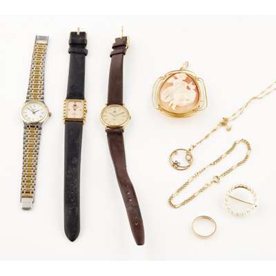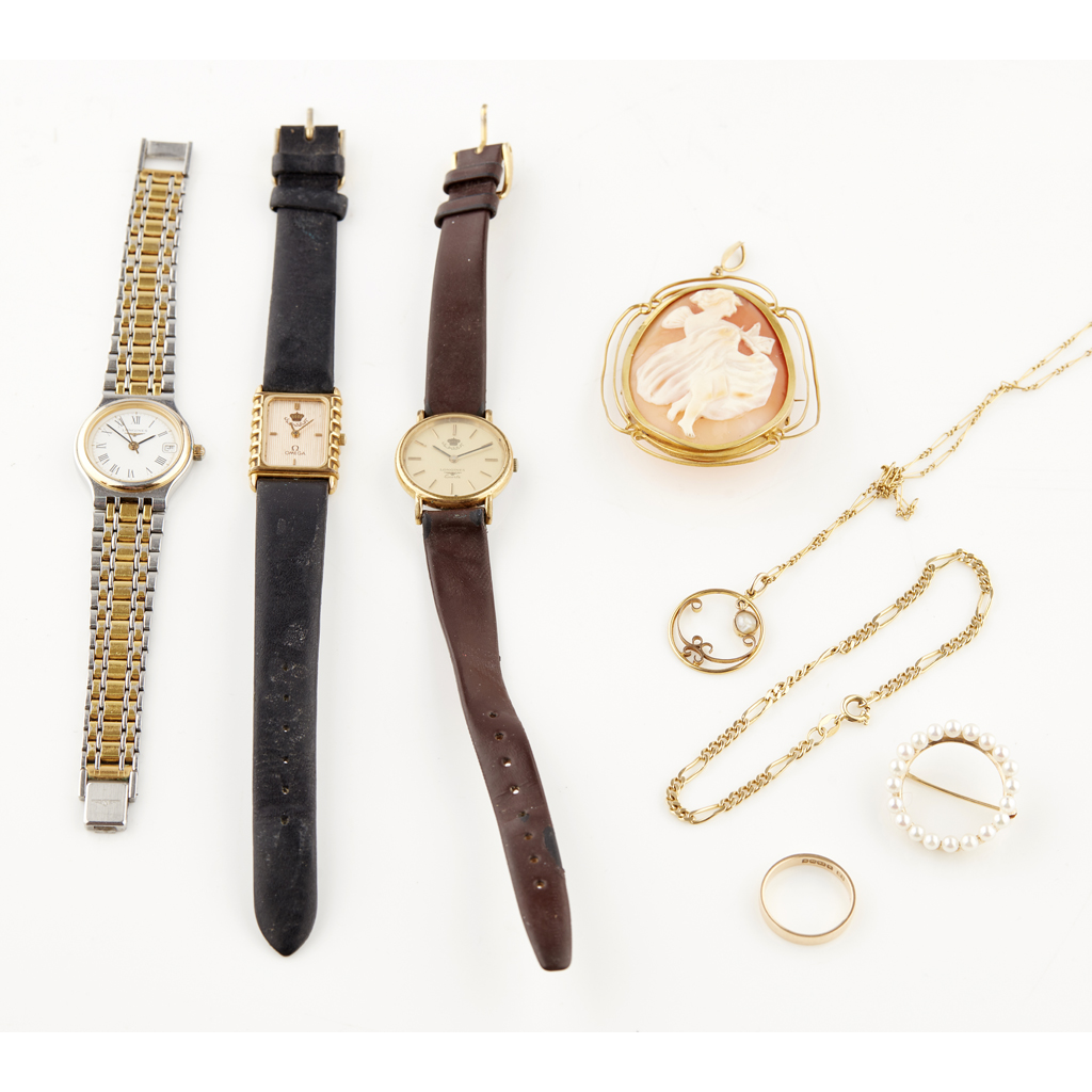 to include a pearl set pendant necklace, a 9ct gold engraved locket, a cameo brooch, an 18ct gold wedding band; a lady's stainless steel Longines wrist watch, a ruby and diamond set ring, curb link bracelet and pearl brooch; a small gilt cased Longines wrist watch and another by Omega, both quartz (qty)