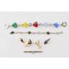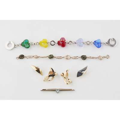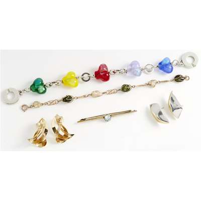 to include an aquamarine set bar brooch; a pair of scrolling earrings, stamped 14k; a pair of contemporary silver earrings, a silver and glass bead bracelet, and another pearl and gem set bracelet stamped 9ct (5)