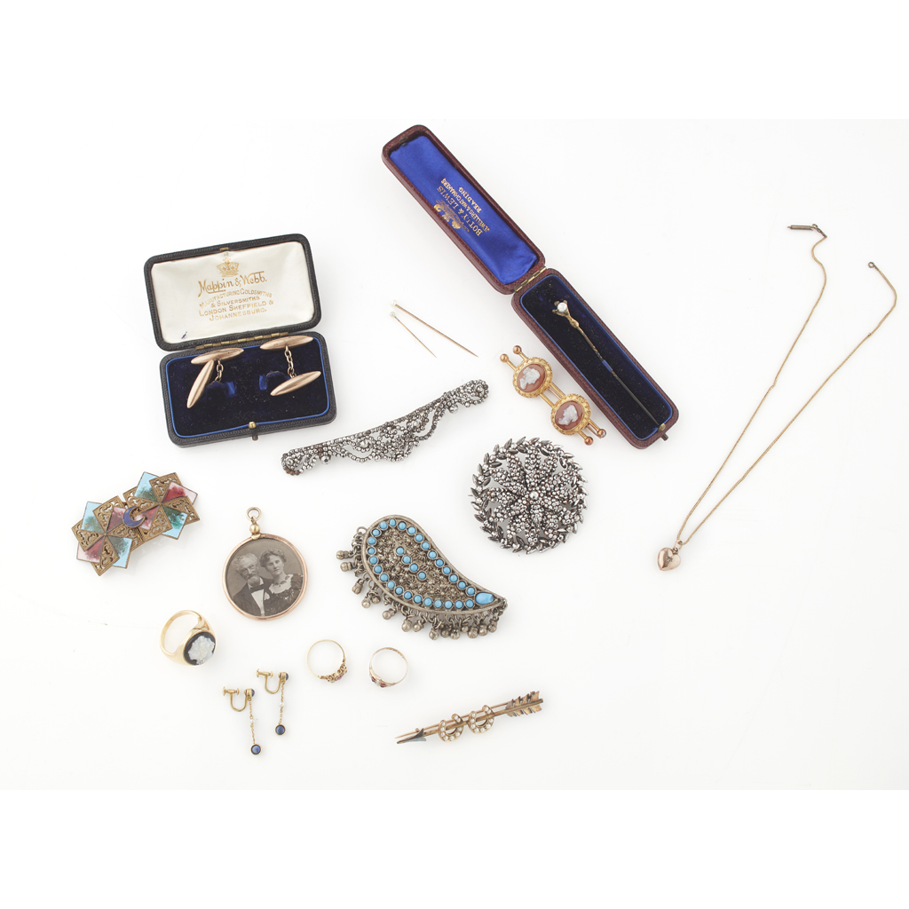 to include a gentleman's cameo ring, unmarked; a pair of 9ct gold cufflinks in a Mappin & Webb box; a pair of pearl and sapphire pendant earrings; a circular double sided pendant locket; a diamond and ruby ring; various other brooches, rings and pendants etc (qty)