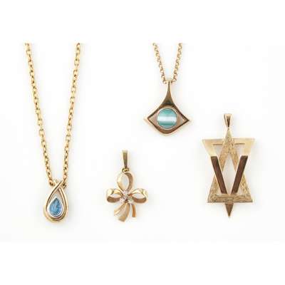 to include a 9ct gold banded agate set pendant, to a belcher link chain stamped 9ct; a 9ct gold stylised star pendant; a 9ct gold blue topaz set pendant, to a yellow metal chain, unmarked; a small scrolling pendant, stamped 9ct (4)