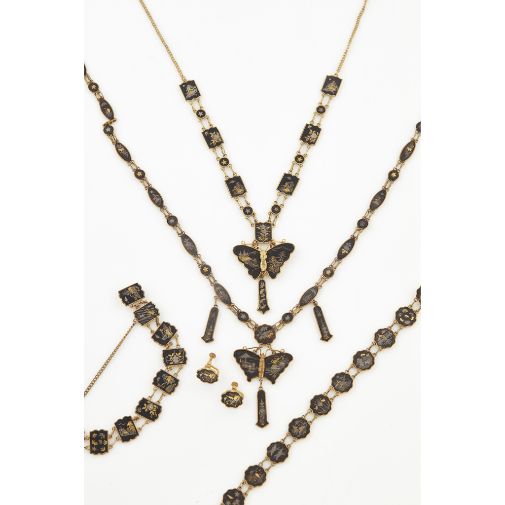 to include two necklaces with butterfly pendants, each link with traditional floral or pastoral scene detail; two bracelets of similar traditional design; a pair of associated earrings with screw back fittings (5)