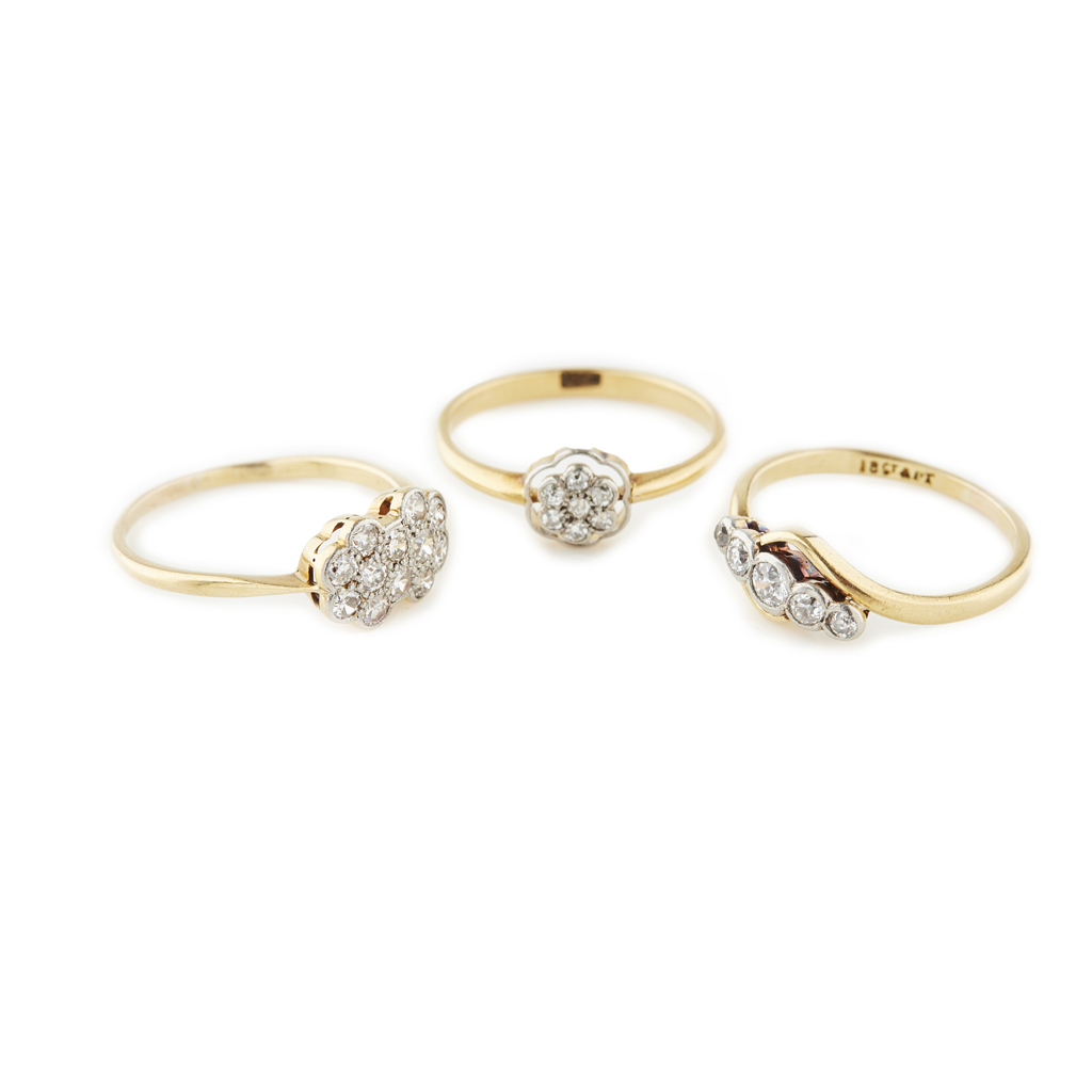 to include a five stone diamond ring, stamped 18ct PLAT; a small diamond cluster ring, stamped 18ct and a diamond set double cluster ring, marks indistinct (3)