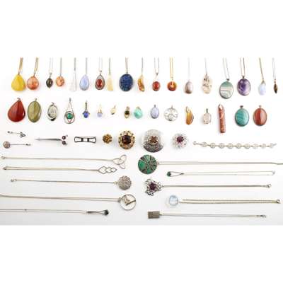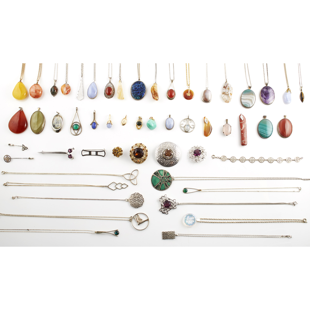 to include various polished hardstone and banded agate pendant necklaces; various Celtic style pendant necklaces and bracelets of traditional knotted design, some gem set; two Celtic style gem set brooches and various other pieces of costume jewellery (qty)