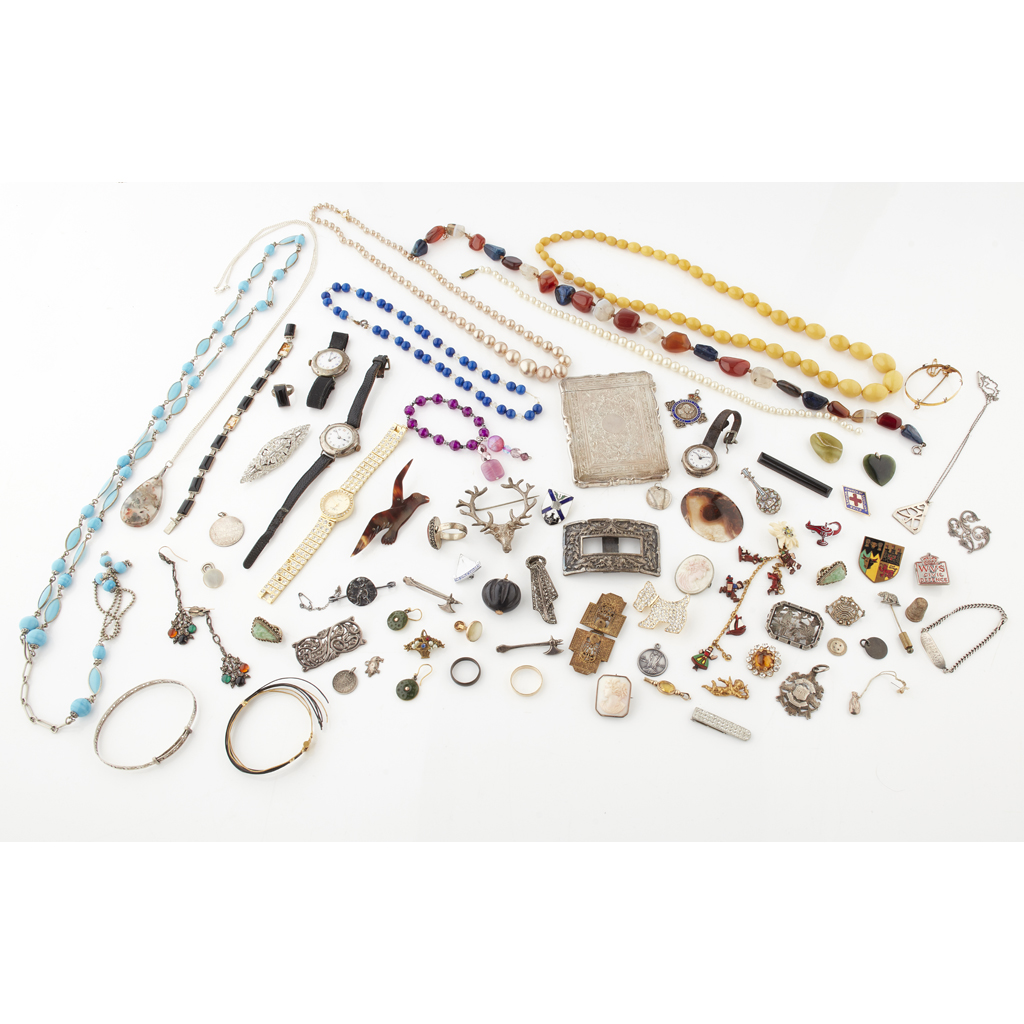to include various beaded necklaces, silver wrist watches, a silver card case, silver brooches and pendants, various other costume and gem set brooches, necklaces, earrings etc