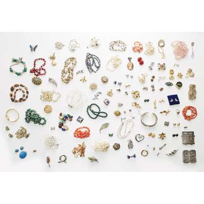 to include various beaded necklaces, a yellow metal bangle; various cultured and faux pearl necklaces, carved coral beads; various costume and hardstone brooches, various pieces of filigree and eastern jewellery, including buckles etc; various pairs of gem set and costume earrings, various other pieces of costume jewellery (qty)
