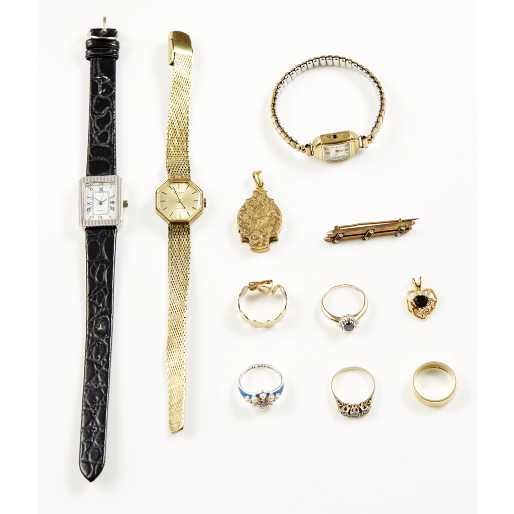 to include a three stone diamond ring, and 18ct gold wedding band; a sapphire and diamond set cluster ring, stamped 9k, a sapphire pendant; a Victorian gold locket, seed pearl and ruby bar brooch; three wrist watches etc (qty)