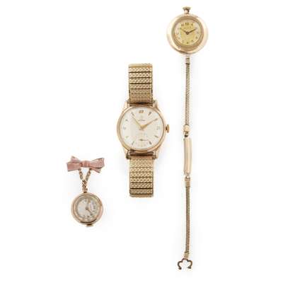 mid-20th century, cream dial, gilt baton and Arabic numerals, subsidiary seconds dial, later flexible bracelet; together with a lady's gold cased wrist watch, by Waltham, broad bezel, bracelet detached and a small enamel and yellow metal cased pendant watch, with enamelled bow (3)