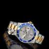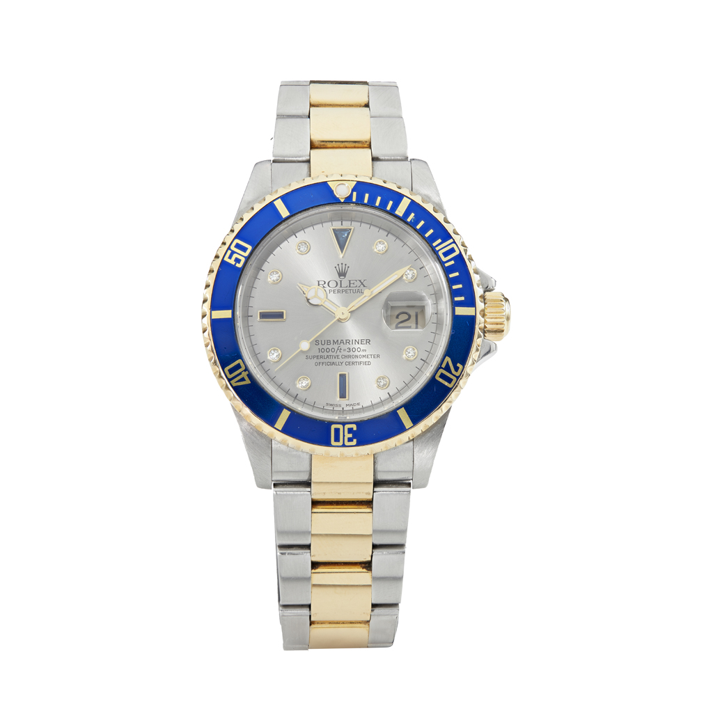 Oyster Perpetual Datejust, Submariner 300m. satin finish dial with Serti Blue Sapphire indicators to the quarters and diamond set indicators between, sweep second hand, date aperture, rotating blue and gold bezel, Oyster bracelet, deployant clasp, screw down crown