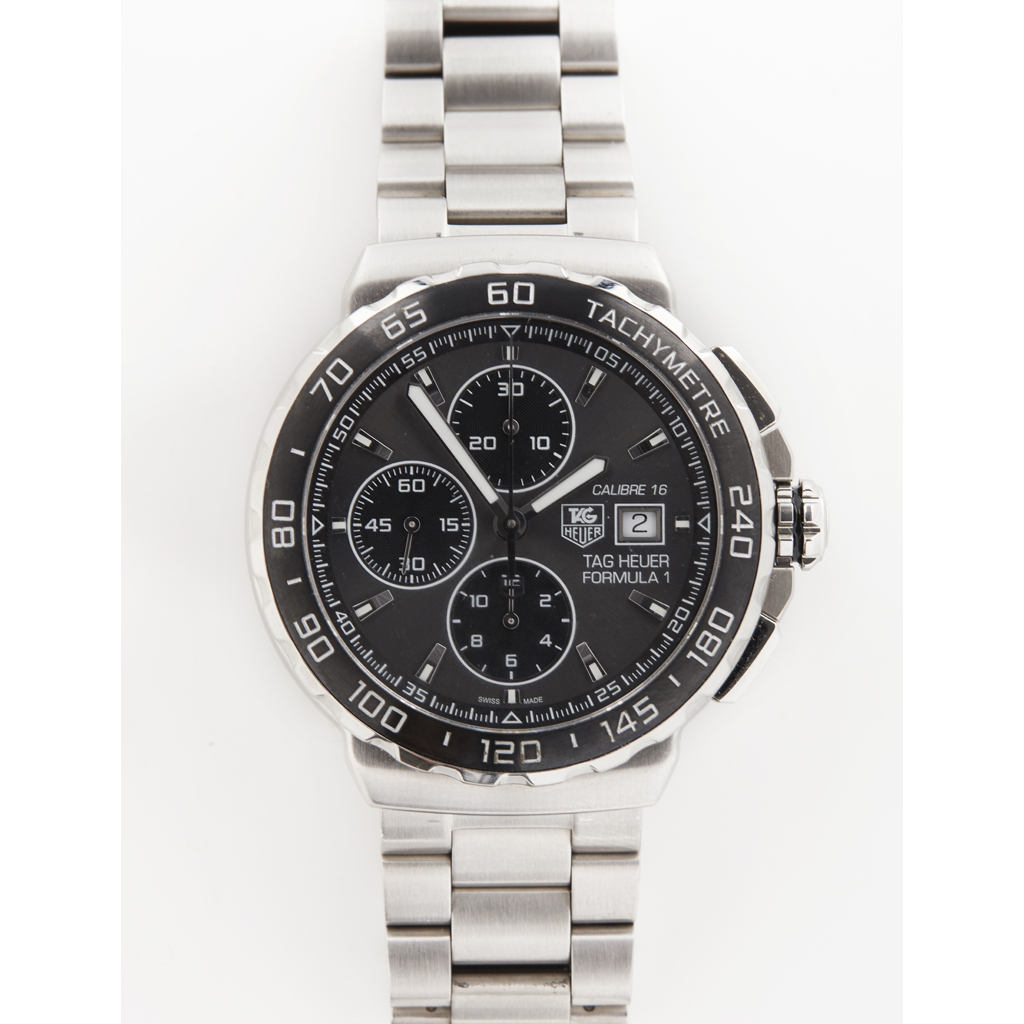 Formula 1, Calibre 16, tachymetere bezel, satin silvered dial, subsidiary dials, luminous hands, date aperture, screw down winder, integral stainless steel bracelet, double fold over clasp