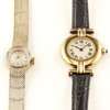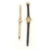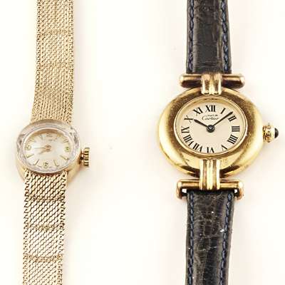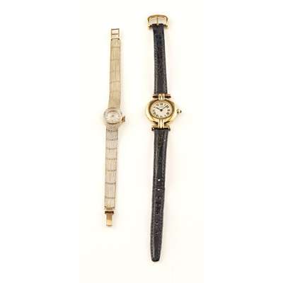 small round dial, Must de Cartier, Roman numerals, bar to leather strap, sapphire cabochon crown; together with a mid 20th century 9ct gold cased wrist watch, small round dial, integral flexible bracelet (2)