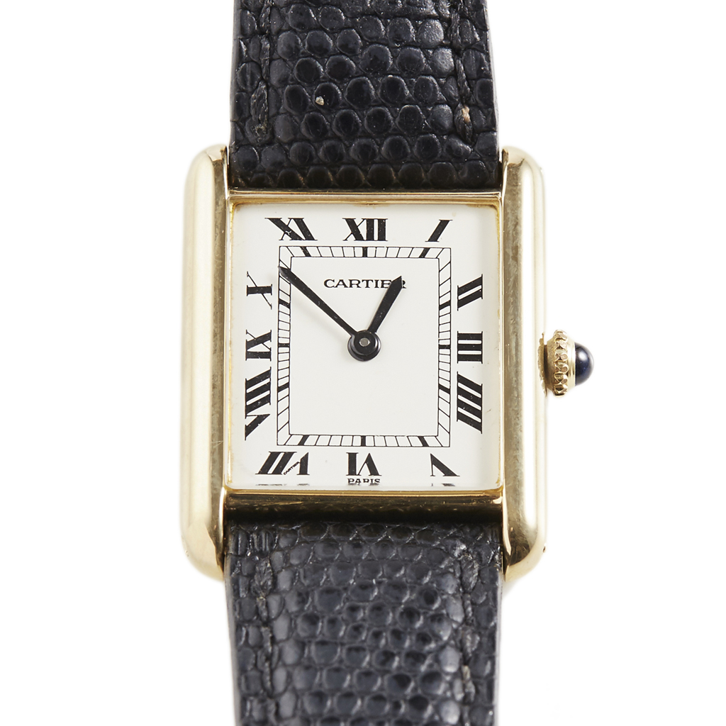 Tank model, plain case, off white dial, Roman numerals, sapphire cabochon crown, rear of case stamped 18K and indistinctly numbered, leather strap, Cartier buckle, mechanical movement