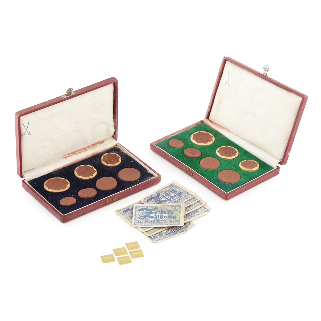 20 marks down to 20 pfenning, 1921, together with five small yellow metal squares stamped Baker 22ct, a group of 10pfg banknotes (qty)