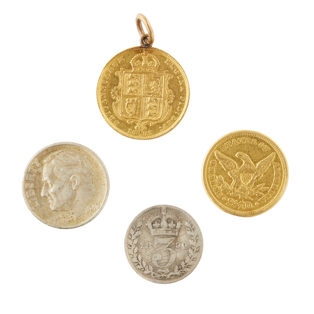 1853, fair condition; GB, a half sovereign, 1887, (holed), two other coins 3d and a dime (4)
