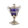 French control marks, mid 19th century, the cover with a large butterfly finial, pierced card work to the plain cover, the frame of classical form, with vine leaves and anthemion detail, scroll wire work handles, all on a stem with four legs to a platform base, anthemion and ball feet, blue glass liner