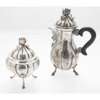 various marks, Maltese cross, AQ, 917, the baluster shaped water pot with rose finial, scroll handle, panelled body, scroll legs hoof feet, the sugar bowl similar (2)